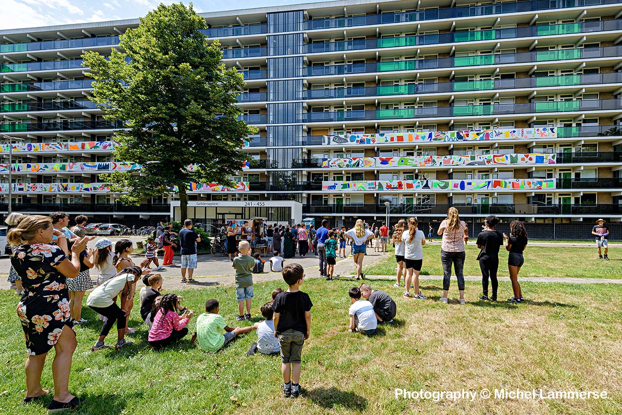 Vanmiddag in het bijzijn van heel veel kinderen van basisscholen Het Mozaïek en Johannesschool  werden tientallen beschilderingen – op 500 meter doek in totaal – feestelijk onthult aan de balustrades van de twee flats aan het Gelderseplein. De beschilderde doeken zijn het afgelopen jaar gemaakt door leerlingen van de beide basisscholen. Ondersteuning kregen ze daarbij van kunstenaars Krista Burger en Kenneth Letsion.