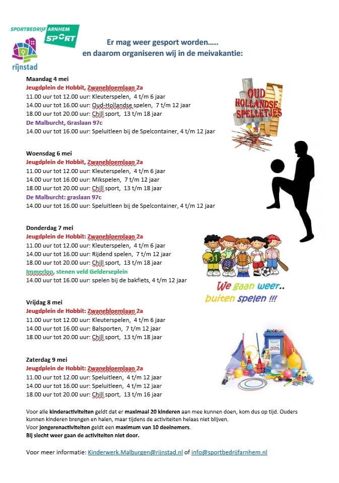 Er mag weer samen gespeeld en gesport worden door kinderen en tieners, rekening houdend met de versoepelde maatregelen. Rijnstad en Sportbedrijf hebben deze meivakantie een programma neergezet voor kinderen en tieners. Meeste activiteiten op het rond het Sportplein bij de Hobbit.