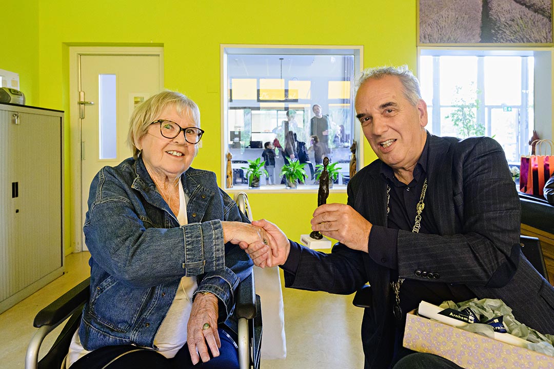 Wijkbewoner Wilma Koel ontving op donderdagmiddag 26 september uit handen van loco-burgemeester en wethouder Bob Roelofs het Arnhems Meisje, een bijzonder beeldje dat wordt uitgereikt aan inwoners die zich op een bijzondere manier hebben ingezet voor de Arnhemse samenleving. Wilma kreeg het beeldje tijdens haar afscheid als coördinator van het taalaanbod van Stichting Prisma in het Huis voor de Wijk.