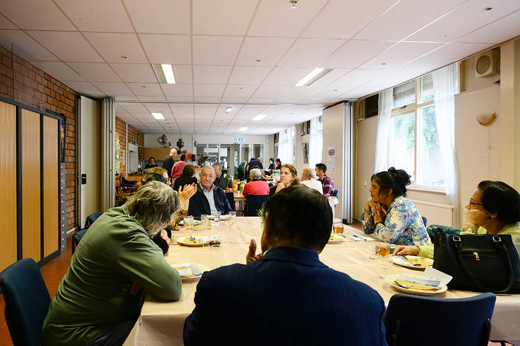 Tijdens de gratis lunch, aangeboden door Rijnstad en bereid door vrijwilligers van het buurtcentrum, gingen de deelnemers in kleine groepjes in gesprek over bekende thema’s en onderwerpen. Het centrale thema van de middag was: “Democratie – en wat betekent dat voor jou?” De bijeenkomst werd georganiseerd door de opbouwwerkers van Rijnstad, die hiermee bewoners willen stimuleren om met elkaar in gesprek te gaan over maatschappelijke betrokkenheid en democratie.