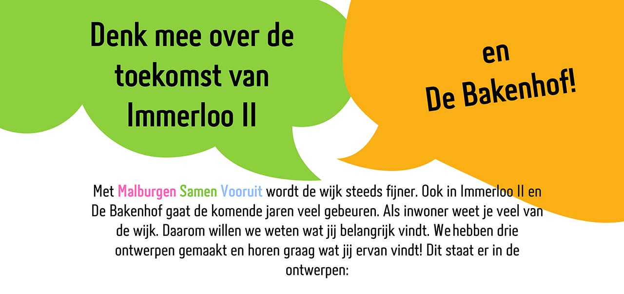 Met Malburgen Samen Vooruit wordt de wijk steeds fijner. Dok in lmmerloo en De Bakenhof gaat de komende jaren veel gebeuren. Als inwoner weet je veel van dit wijkdeel. Daarom willen we weten wat jij belangrijk vindt. We hebben drie ontwerpen gemaakt en horen graag wat jij ervan vindt! Dit staat er in de ontwerpen: