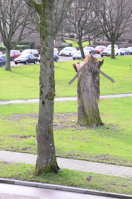 Wat doe je met een stuk oude stam – overblijfselen na een storm van eens een grote wilg. Nu een stuk troosteloos groen met onkruid en wat voor honden dienst doet als grote pispaal.