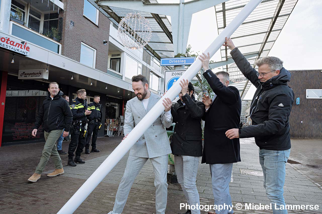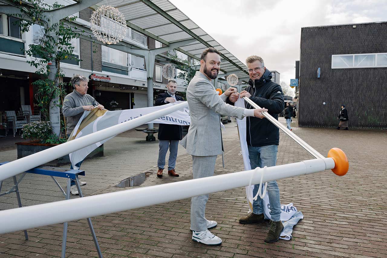 Wethouder Mark Lauriks samen met ondernemers en raadsleden tijdens de presentatie van de nieuwe huisstijl van het winkelcentrum en het ophangen van de bijbehorende vlaggen. Foto: Michel Lammerse – via gemeente Arnhem