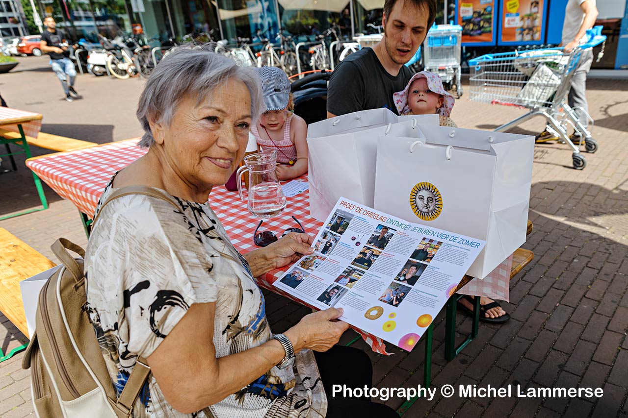 Eten werd gedaan aan naast elkaar geplaatste vrolijk gedekte tafels dat als een lint door het winkelcentrum liep. De winkeliers boden een ruime keuze; van fruit tot hartige broodjes en van Noord-Afrikaanse zoetigheden tot een ijsje van IJsje Zuid.