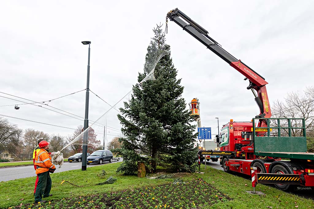 De bomenploeg van de gemeente Arnhem is zoals elk jaar verantwoordelijk voor de plaatsingen in de stad. Dit jaar op alle locaties een Duits exemplaar van zo’n 8 meter hoog.