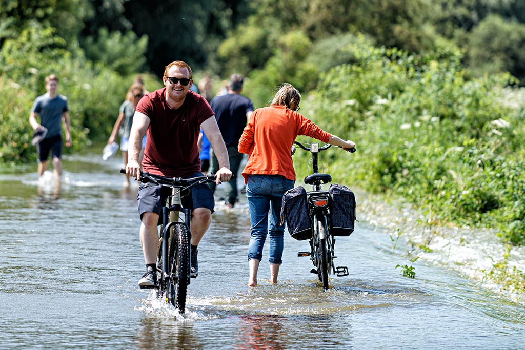 Dat hoogwater niet alleen voor veel ellende zorgt maar ook plezier bleek het afgelopen weekend in de Malburgse uiterwaarden. Vele duizenden dagjesmensen brachten een bezoek aan Stadsblokken en Meinerswijk om het hoge water te bekijken, er doorheen te wandelen of te fietsen, in te spelen of te zwemmen. De komende dagen wordt het warm weer maar Rijkswaterstaat en de waterschappen waarschuwen om vooral niet te gaan zwemmen in de uiterwaarden en Rijn.