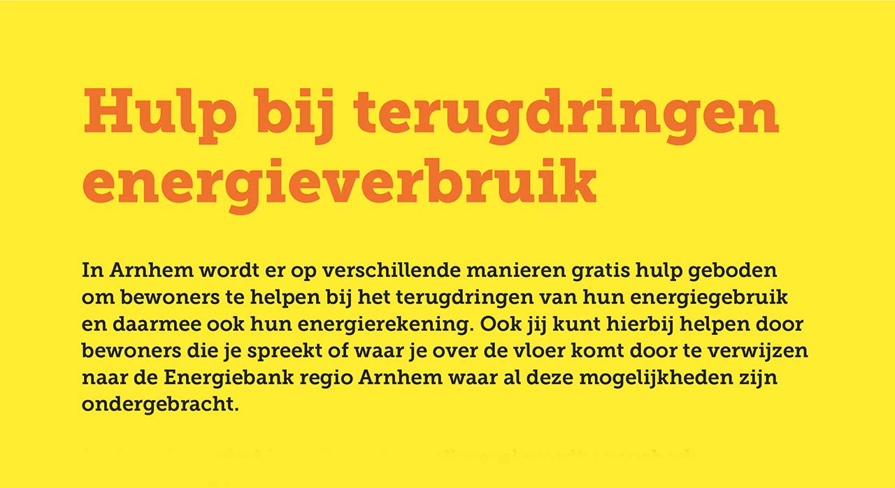 In Arnhem wordt er op verschillende manieren gratis hulp geboden om bewoners te helpen bij het terugdringen van hun energiegebruik en daarmee ook hun energierekening. Ook jij kunt hierbij helpen door bewoners die je spreekt of waar je over de vloer komt door te verwijzen naar de Energiebank regio Arnhem waar al deze mogelijkheden zijn ondergebracht.