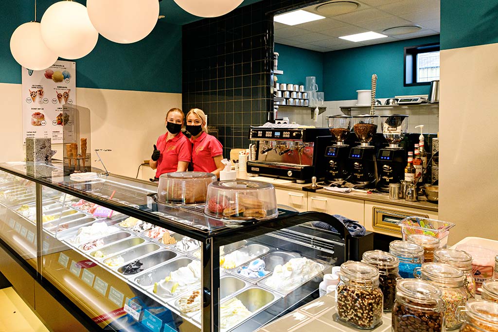 De wijkmedia nam afgelopen zaterdagavond een kijkje (en ijsje) en sprak met eigenaar Theo Hegeman over zijn nieuwe onderneming. Wat gelijk opvalt als je binnenkomt is de grote verlichte ijsvitrine met twee vriendelijk lachende (gemaskerde) medewerkers. In de mooi modern ingerichte zaak zijn diverse zitjes gemaakt, waar helaas nu niet op gezeten mag worden vanwege corona. Buiten staat overigens een uitnodigende lange houten bank waar je prima met voldoende afstand op kan zitten. De ijswinkel is gehuisvest in het voormalige pand van de viswinkel, midden op het winkelcentrum.