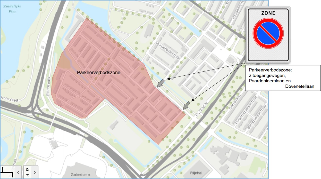 Waar de parkeerverbodzone precies is wordt aangegeven middels bebording, zie de afbeeldingen hieronder voor locatie van de bebording en het gebied.