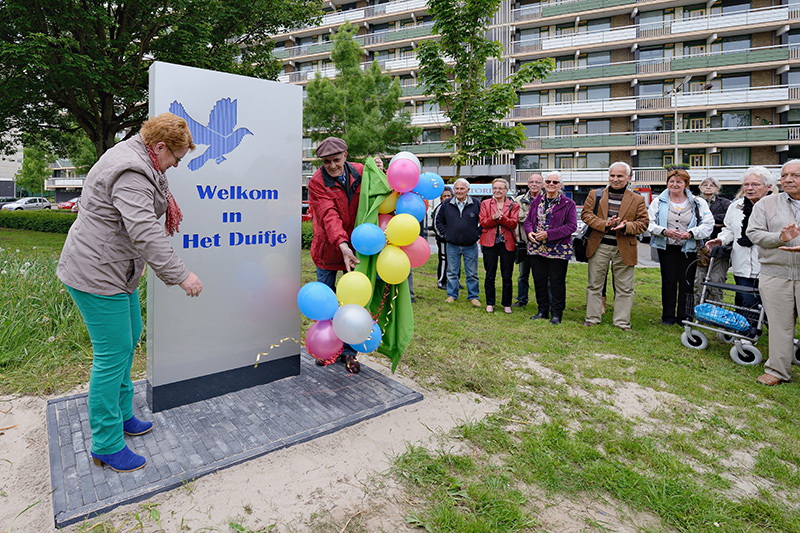 Leden van de Wijkbeheergroep nemen het welkomstbord feestelijk in gebruik