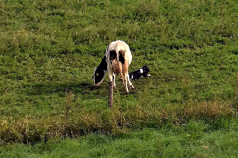 Nee loop bij de boerderij. Hij is het kalfje met moeder opgehaald.