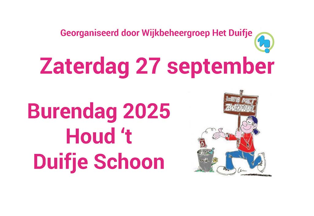 Het is inmiddels een mooie traditie in wijkdeel Het Duifje: samen zwerfafval opruimen tijdens de landelijke Burendag. Elke editie met veel deelnemers, waaronder de laatste jaren ook meer kinderen, en elk jaar is het resultaat beter zichtbaar. Dit jaar vindt de Burendag opruimactie plaats op zaterdag 27 september, tussen 10:00 – 12:00 uur.